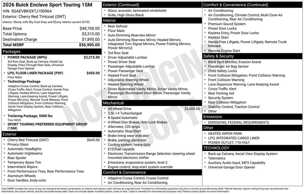 Cherry Red Tintcoat 2026 Buick Enclave Sport Touring FWD 8-Speed Automatic 2.5L DOHC Enclave Sport Touring, 4D Sport Utility, 2.5L DOHC, FWD, Cherry Red Tintcoat, Ebony With Sky Gray Ebony Interior Accent Artificial Leather, 110-Volt Power Outlet, 1st & 2nd Row All-Weather Floor Liners (LPO), 2nd Row 1-Touch Flat Folding Seat, 3rd Row 60/40 Power Split-Folding Bench, 3rd Row All-Weather Floor Liner (LPO), Floor Liner Package (LPO), Head-Up Display, Heated Wiper Park, Inside Rearview Auto-Dimming Rear Camera Mirror, Integrated Cargo Liner (LPO), Memory Settings, Navigation System, Power Liftgate, Power Package, Preferred Equipment Group 1SM, Universal Home Remote.