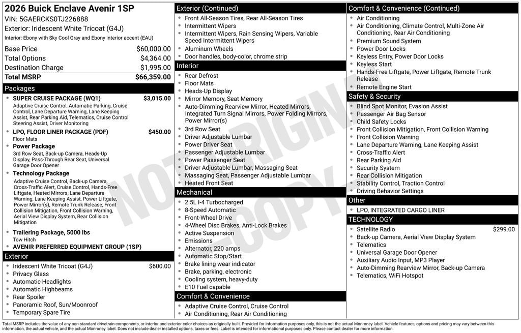 iridescent white tricoat 2026 Buick Enclave Avenir FWD 8-Speed Automatic 2.5L DOHC 4D Sport Utility, 2.5L DOHC, FWD, iridescent white tricoat, 1st and 2nd Row All-Weather Floor Liners, 3rd Row All-Weather Floor Liner, Driver Attention Assist, Enhanced Automatic Parking Assist, Floor Liner Package, Integrated Cargo Liner, Navigation System, Super Cruise, Super Cruise Package.