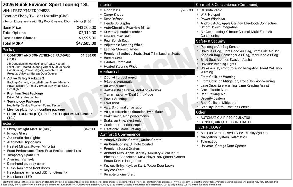 Ebony Twilight Metallic 2026 Buick Envision Sport Touring AWD 9-Speed Automatic 2.0L Turbocharged 3-Channel Programmable Universal Home Remote, 30 Diagonal LCD Display, 4-Wheel Disc Brakes, 9 Speakers, ABS brakes, Air Conditioning, Air Quality Indicator Sensor, AM/FM radio: SiriusXM, Auto High-beam Headlights, Auto-dimming door mirrors, Auto-dimming Rear-View mirror, Automatic Air Recirculation, Automatic temperature control, Bose Premium 9-Speaker Audio System Feature, Brake assist, Comfort and Convenience Package, Compass, Delay-off headlights, Driver 4-Way Power Lumbar Seat Adjuster, Driver 8-Way Power Seat Adjuster, Driver door bin, Driver vanity mirror, Dual front impact airbags, Dual front side impact airbags, Dual-Zone Automatic Climate Control Air Conditioning, Ebony 1st and 2nd Rows All-Weather Floor Liners (LPO), Electronic Stability Control, Emergency communication system: OnStar and Buick connected services capable, Exterior Parking Camera Rear, Four wheel independent suspension, Front anti-roll bar, Front Bucket Seats, Front Center Armrest, Front Passenger 6-Way Manual Seat Adjuster, Front reading lights, Fully automatic headlights, Hands-Free Power Programmable Liftgate, Heads-Up Display, Heated door mirrors, Heated Driver and Front Passenger Seats, Heated Steering Wheel, Illuminated entry, Knee airbag, Leather steering wheel, Low tire pressure warning, Memory seat, Navigation System, Occupant sensing airbag, Outside temperature display, Overhead airbag, Overhead console, Panic alarm, Passenger door bin, Passenger vanity mirror, Perforated Leather-Appointed Seat Trim, Power door mirrors, Power driver seat, Power Liftgate, Power steering, Power windows, Preferred Equipment Group 1SL, Premium audio system: Buick Infotainment System, Radio: Infotainment Center, Rear anti-roll bar, Rear reading lights, Rear seat center armrest, Rear window defroster, Rear window wiper, Remote keyless entry, Security system, SiriusXM Trial Subscription, Speed control, Split folding rear seat, Sport steering wheel, Steering wheel mounted audio controls, Telescoping steering wheel, Tilt steering wheel, Traction control, Trip computer, Variably intermittent wipers, Wheels: 20 Carbon Flash Metallic Alloy, Wireless Apple CarPlay/Wireless Android Auto.