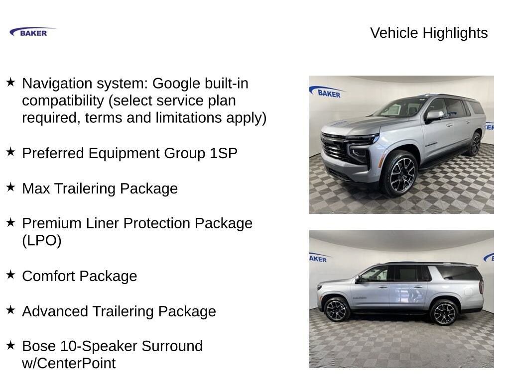 Sterling Gray Metallic 2025 Chevrolet Suburban RST 4WD 10-Speed Automatic with Overdrive EcoTec3 5.3L V8 Suburban RST, 4D Sport Utility, EcoTec3 5.3L V8, 10-Speed Automatic with Overdrive, 4WD, Sterling Gray Metallic, Jet Black/Victory Red Leather, 1st & 2nd Rows Premium Floor Liners (LPO), 2-Speed Active Electronic AutoTrac Transfer Case, 2nd Row Pwr Release 60/40 Split-Folding Bench Seat, 3rd Row 60/40 Power-Folding Split-Bench, 3rd Row All-Weather Floor Liners (LPO), 8-Way Power Front Passenger Seat Adjuster, Advanced Trailering Package, All-Weather Cargo Mat (LPO), Auto-Dimming Inside Rear-View Mirror, Blind Zone Steering Assist w/Trailering, Bose 10-Speaker Surround w/CenterPoint, Bright Front & Rear Door Sill Plates, Comfort Package, Dual Exhaust System, Front LED Fog Lamps, Heated 2nd Row Outboard Seats, Heated Driver & Front Passenger Seats, Heated Power-Adjustable Outside Mirrors, Heated Steering Wheel, Hill Descent Control, Hitch View w/Pan/Zoom Image Adjustment, Integrated Trailer Brake Controller, LED Headlamps w/LED Daytime Running Lamps, LED Tail Lamps, Max Trailering Package, Memory Settings, Memory Settings For Driver, Navigation system: Google built-in compatibility (select service plan required, terms and limitations apply), Preferred Equipment Group 1SP, Premium Liner Protection Package (LPO), Rear Power Liftgate, RST Exterior Features, Smart Trailer Integration Indicator, Universal Home Remote, Wireless Phone Charging.