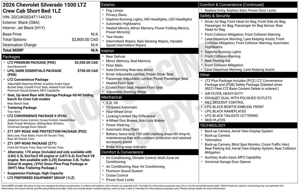 Black 2026 Chevrolet Silverado 1500 LTZ 4WD 10-Speed Automatic EcoTec3 5.3L V8 Silverado 1500 LTZ, 4D Crew Cab, EcoTec3 5.3L V8, 4WD, Black, 2 USB Data Ports, 2nd Row Heated Outboard Seats, Adaptive Cruise Control, All-Weather Floor Liner (LPO) (AAK), Black Name Plates (LPO), Chevytec Spray-On Black Bedliner, Dark Essentials Package (LPO), Dual Exhaust w/Black Exhaust Tips, Floor Mounted Center Console, HD Surround Vision, Heavy-Duty Air Filter, High Capacity Suspension Package, Hill Descent Control, Hitch Guidance, LTZ Convenience Package, LTZ Convenience Package II, LTZ Plus Package, LTZ Premium Package, Off-Road Suspension, Perimeter Lighting, Power Sliding Rear Window w/Rear Defogger, Power Sunroof, Power Tilt & Telescoping Steering Column, Premium Bose 7-Speaker Sound System, Rear Cross Traffic Braking, Rear Pedestrian Alert, Safety Alert Seat, Safety Package, Trailer Camera Provisions, Trailer Side Blind Zone Alert, Trailering Package, Ultrasonic Front & Rear Park Assist, Universal Home Remote, Up-Level Rear Seat w/Storage Package, Ventilated Driver & Front Passenger Seats, Wireless Charging, Z71 Off-Road & Protection Package, Z71 Off-Road Package.