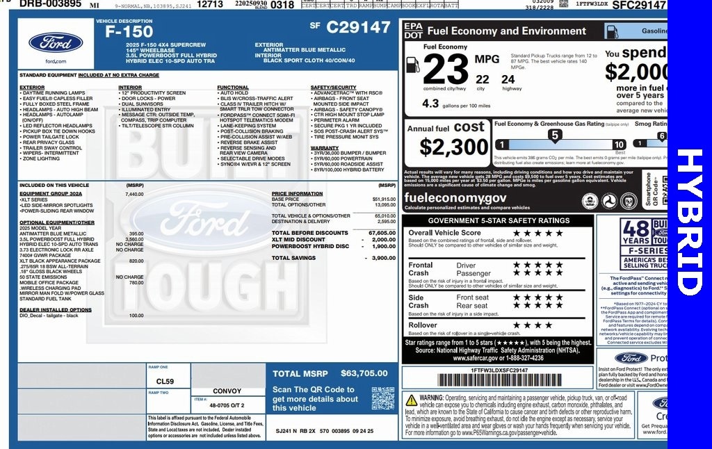 F-150 XLT, 4D SuperCrew, 3.5L PowerBoost Full-Hybrid V6, 10-Speed Automatic, 4WD, Antimatter Blue Metallic, Sport 40 Console 40 Black Cloth, 360 Degree Camera, 400W Cab & Bed Outlets, 6" Angular Bright Anodized Step Bar, 6" Black Running Boards, Adaptive Cruise Control w/Stop & Go, Auto-Dimming Rear-View Mirror, Black Exterior Badging, Black Grille, Black Painted Grille w/Chrome Center Bar, Body-Color Front & Rear Bumpers, Chrome Door & Tailgate Handles, Chrome Single-Tip Exhaust, Cloth 40/Console/40 Front Seats, Connected Navigation, Console Worksurface, Dark Interior Appliques, Driver State Detection, Dual-Zone Electronic Automatic Temperature Control, Equipment Group 302A Mid, Evasive Steering Assist, Floor Shifter, Ford Co-Pilot360 Assist 2.0, Front Parking Sensors, Gray Box Side Decal, Heated Front Seats, Intelligent Access w/Push Button Start, Mobile Office Package, Partitioned Lockable Rear Storage, Power Glass Heated Sideview Mirrors, Power-Sliding Rear Window, Remote Start System w/Remote Tailgate Release, Towing Technology, Unique Sport Cloth 40/Console/40 Front-Seats, Wheels: 18" Gloss Black, Wrapped Steering Wheel, XLT Black Appearance Package.