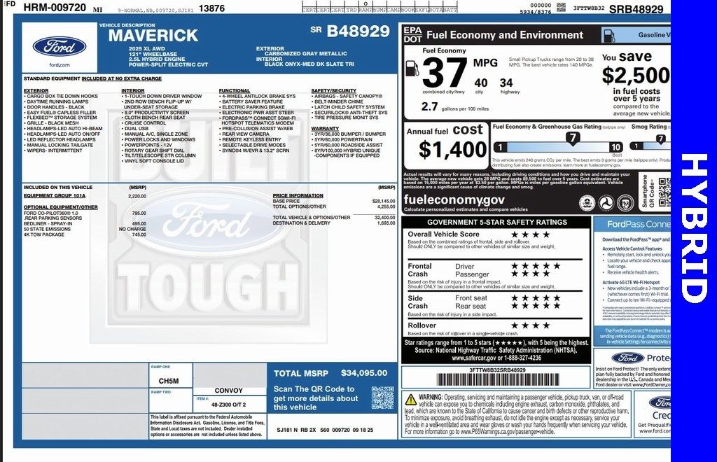 Maverick XL, 4D Crew Cab, 2.5L I-4 Hybrid, CVT, AWD, Carbonized Gray Metallic, Ebony Cloth, 4K Tow Package, Equipment Group 101A, Trailer Brake Controller, Trailer Hitch (Class III) 2" Receiver, Transmission Oil Cooler, Upgraded Cooling Fan. 40/34 City/Highway MPG