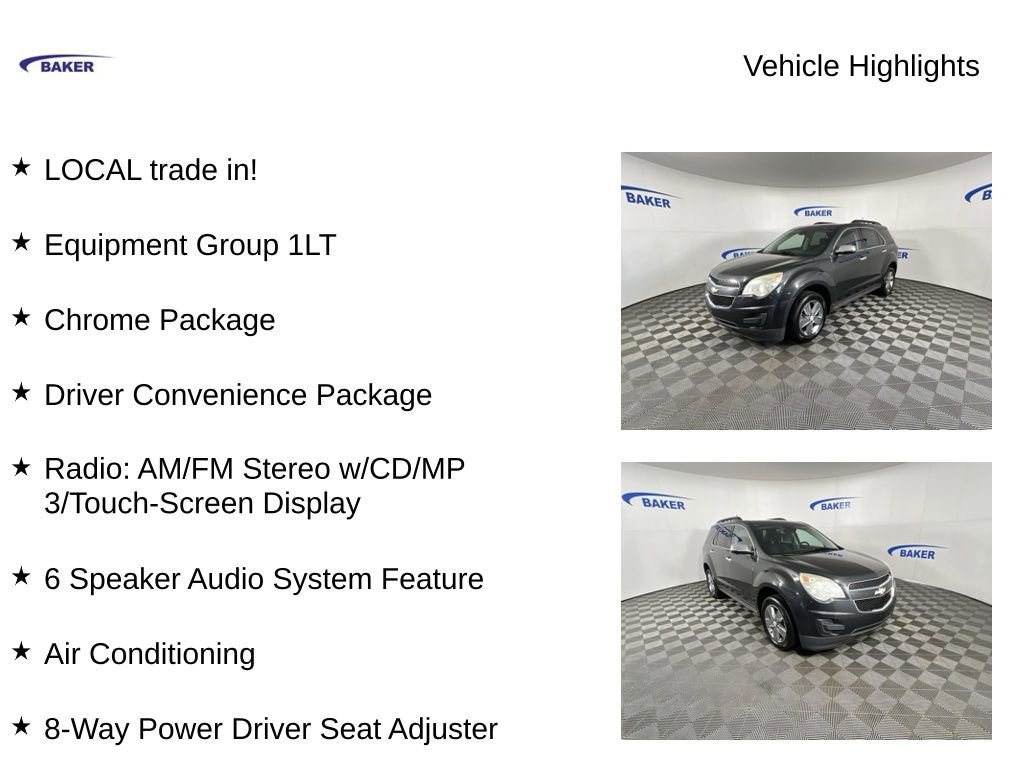 Ashen Gray Metallic 2013 Chevrolet Equinox LT 1LT FWD 6-Speed Automatic with Overdrive 2.4L 4-Cylinder SIDI DOHC LOCAL trade in!, Equinox LT 1LT, 2.4L 4-Cylinder SIDI DOHC, 6-Speed Automatic with Overdrive, FWD, Ashen Gray Metallic, 18 Chrome-Clad Aluminum Wheels, 6 Speaker Audio System Feature, 8-Way Power Driver Seat Adjuster, Air Conditioning, Black All-Weather Rear Cargo Mat (LPO), Chevrolet MyLink Touch, Chrome Heated Power-Adjustable Outside Mirrors, Chrome Package, Driver Convenience Package, Equipment Group 1LT, Exterior Parking Camera Rear, Power driver seat, Radio: AM/FM Stereo w/CD/MP3/Touch-Screen Display.