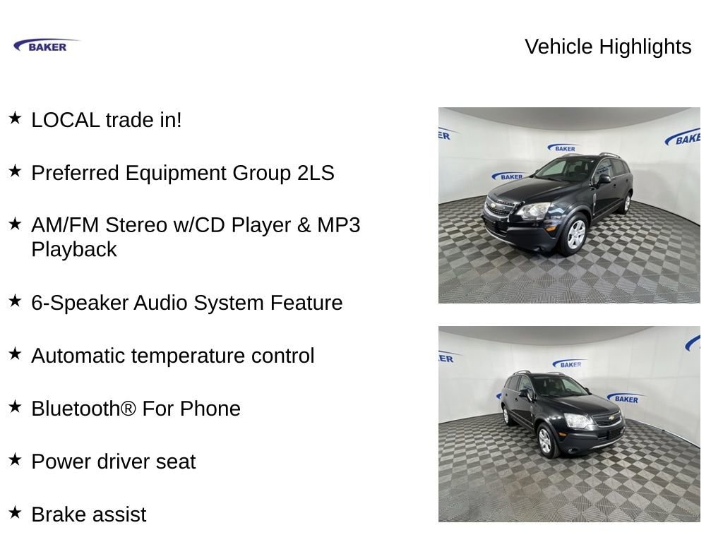 New Price! Black Granite Metallic 2014 Chevrolet Captiva Sport 2LS 2LS FWD 6-Speed Automatic 2.4L 4-Cylinder SIDI DOHC VVT LOCAL trade in!, Captiva Sport 2LS 2LS, 2.4L 4-Cylinder SIDI DOHC VVT, 6-Speed Automatic, FWD, Black Granite Metallic, 17 x 7 Painted Aluminum (4) Wheels, 6-Speaker Audio System Feature, AM/FM Stereo w/CD Player & MP3 Playback, Automatic temperature control, Bluetooth® For Phone, Brake assist, Power driver seat, Preferred Equipment Group 2LS.