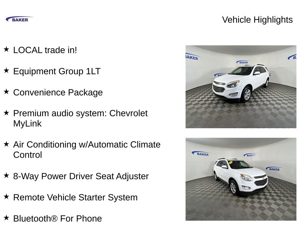 New Price! Summit White 2016 Chevrolet Equinox LT FWD 6-Speed Automatic with Overdrive 2.4L 4-Cylinder SIDI DOHC VVT LOCAL trade in!, Equinox LT, 2.4L 4-Cylinder SIDI DOHC VVT, 6-Speed Automatic with Overdrive, FWD, Summit White, Jet Black Cloth, 17 Aluminum Wheels, 8-Way Power Driver Seat Adjuster, Air Conditioning w/Automatic Climate Control, Bluetooth® For Phone, Convenience Package, Equipment Group 1LT, Exterior Parking Camera Rear, Heated door mirrors, Heated Driver & Front Passenger Seats, Power driver seat, Premium audio system: Chevrolet MyLink, Remote Vehicle Starter System.