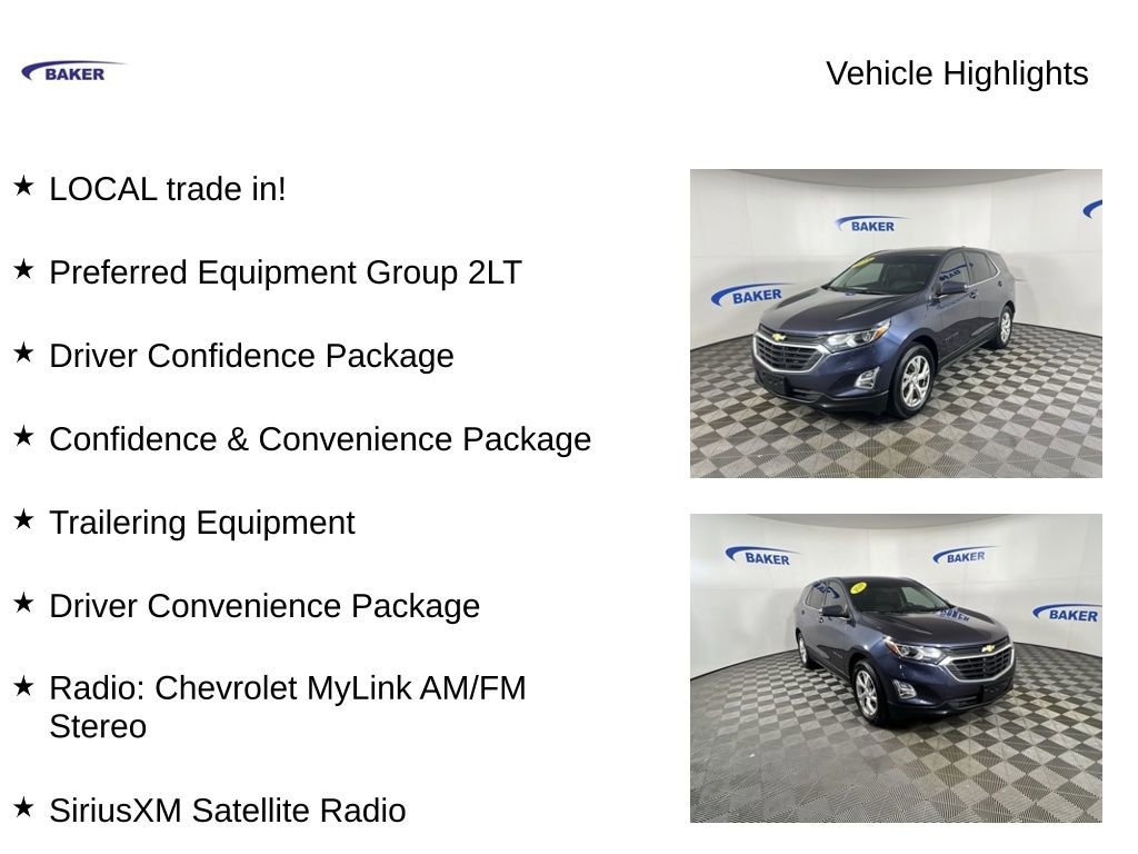 Storm Blue Metallic 2018 Chevrolet Equinox LT AWD 9-Speed Automatic with Overdrive 2.0L Turbocharged LOCAL trade in!, Equinox LT, 2.0L Turbocharged, 9-Speed Automatic with Overdrive, AWD, Storm Blue Metallic, Jet Black Cloth, 18 Aluminum Wheels, 4-Wheel Antilock 4-Wheel Disc Brakes, 6 Speaker Audio System Feature, 8-Way Power Driver Seat Adjuster, Apple CarPlay/Android Auto, Bluetooth® For Phone, Body-Color Trailer Hitch Close-Out Cover, Confidence & Convenience Package, Driver Confidence Package, Driver Convenience Package, Dual Stainless-Steel Exhaust w/Bright Tips, Electronic Stability Control, Exterior Parking Camera Rear, Factory Installed Trailer Hitch, Front Passenger 4-Way Manual Seat Adjuster, Heated front seats, Power driver seat, Power Liftgate, Preferred Equipment Group 2LT, Radio: Chevrolet MyLink AM/FM Stereo, SiriusXM Satellite Radio, Trailering Equipment, USB Port & Auxiliary Input Jack.