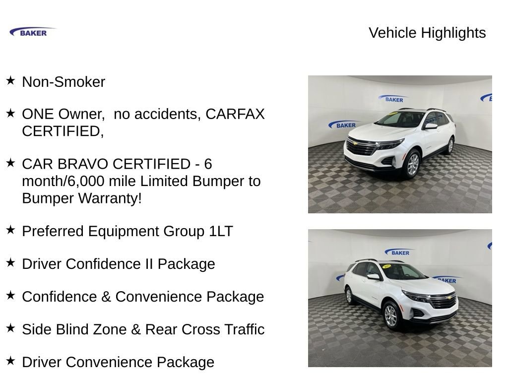 New Price! Iridescent Pearl Tricoat 2023 Chevrolet Equinox LT AWD 6-Speed Automatic Electronic with Overdrive 1.5L DOHC Non-Smoker, ONE Owner, no accidents, CARFAX CERTIFIED,, CAR BRAVO CERTIFIED - 6 month/6,000 mile Limited Bumper to Bumper Warranty!, Equinox LT, 4D Sport Utility, 1.5L DOHC, AWD, Iridescent Pearl Tricoat, Jet Black Cloth, 17 Aluminum Wheels, Confidence & Convenience Package, Driver Confidence II Package, Driver Convenience Package, Lane Change Alert w/Side Blind Zone Alert, Power Sunroof, Preferred Equipment Group 1LT, Rear Cross Traffic Alert, Rear Power Liftgate, Roof-Mounted Luggage Rack Side Rails, Side Blind Zone & Rear Cross Traffic.