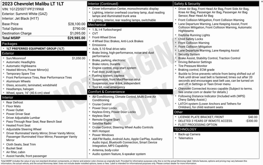 Summit White 2023 Chevrolet Malibu LT 1LT FWD CVT 1.5L DOHC Black Cloth, Preferred Equipment Group 1LT.