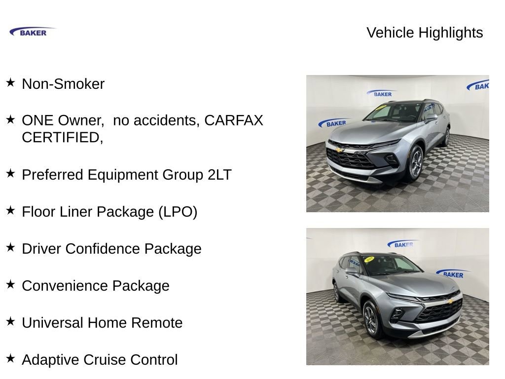 Sterling Metallic 2024 Chevrolet Blazer LT AWD 9-Speed Automatic with Overdrive 2.0L Turbocharged Non-Smoker, ONE Owner, no accidents, CARFAX CERTIFIED,, Blazer LT, 2.0L Turbocharged, 9-Speed Automatic with Overdrive, AWD, Sterling Metallic, Jet Black/Medium Gray Cloth, 1st & 2nd Row All-Weather Floor Liners (LPO), Adaptive Cruise Control, Black Roof-Mounted Side Rails, Convenience Package, Driver Confidence Package, Enhanced Automatic Emergency Braking, Floor Liner Package (LPO), Inside Rear-View Auto-Dimming Mirror, Integrated Cargo Liner (LPO), Lane Change Alert w/Side Blind Zone Alert, Preferred Equipment Group 2LT, Rear Cross Traffic Alert, Rear Park Assist w/Audible Warning, Rear Power Programmable Liftgate, Universal Home Remote, Wireless Charging.CALL US TODAY 6168373800. Recent Arrival! 22/27 City/Highway MPG