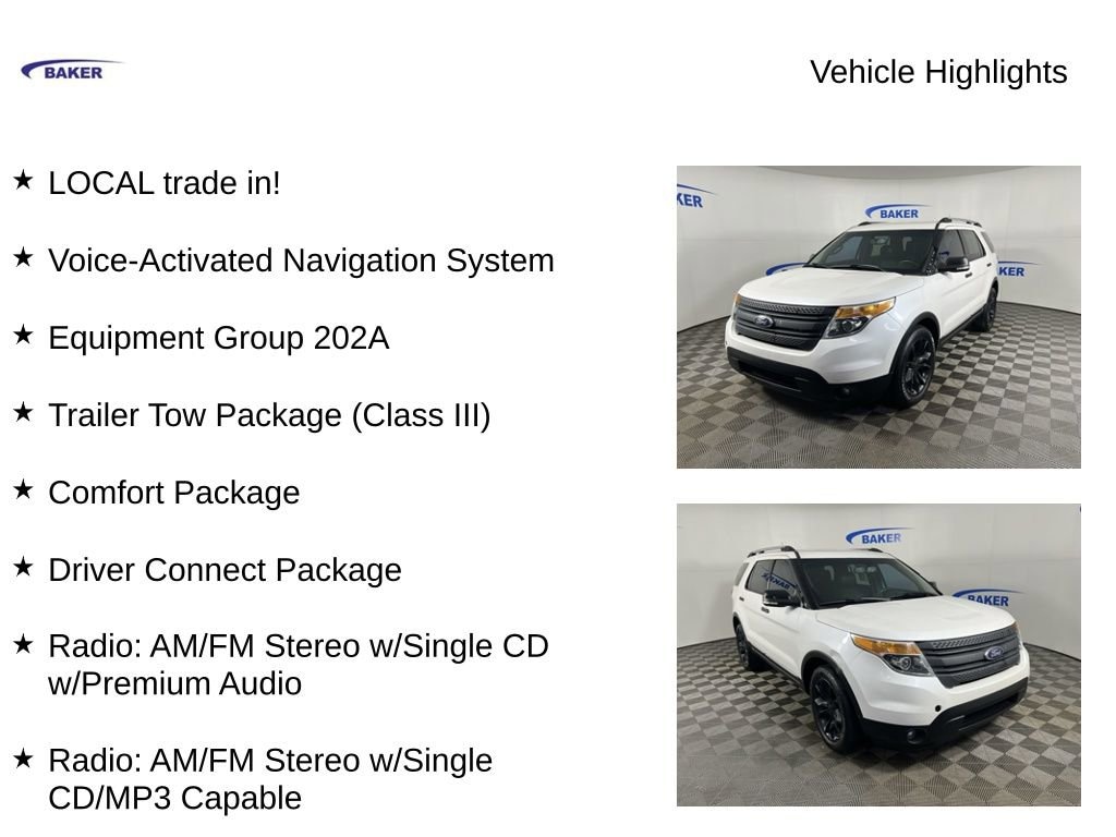 White Platinum Metallic Tri-Coat 2014 Ford Explorer XLT 4WD 6-Speed Automatic with Select-Shift 3.5L 6-Cylinder SMPI DOHC LOCAL trade in!, Explorer XLT, 3.5L 6-Cylinder SMPI DOHC, 6-Speed Automatic with Select-Shift, 4WD, White Platinum Metallic Tri-Coat, Charcoal Black w/Leather-Trimmed Heated Bucket Seats, 18 Painted Aluminum Wheels, 4.7 Pin Wiring Harness, Comfort Package, Driver Connect Package, Dual Zone Electronic Temperature, Engine Oil Cooler, Equipment Group 202A, Power driver seat, Power Liftgate, Radio: AM/FM Stereo w/Single CD w/Premium Audio, Radio: AM/FM Stereo w/Single CD/MP3 Capable, Rear Parking Sensors, Rear-View Camera, SYNC, Trailer Tow Package (Class III), Voice-Activated Navigation System.