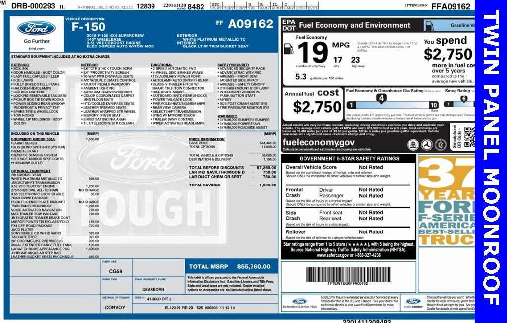 White Platinum Clearcoat Metallic 2015 Ford F-150 Lariat 4WD 6-Speed Automatic Electronic 3.5L V6 One Owner, 4WD, 110V/400W Outlet, Auxiliary Transmission Oil Cooler, BLIS Blind Spot Information System, Chrome 3-Bar Style Grille w/Chrome Surround, Chrome Angular Step Bars, Chrome Door Handles w/Body-Color Bezel, Chrome Skull Caps on Exterior Mirrors, Class IV Trailer Hitch Receiver, Electronic Locking w/3.55 Axle Ratio, Equipment Group 501A Mid, Integrated Trailer Brake Controller, Lariat Chrome Appearance Package, LED Side-Mirror Spotlights, Max Trailer Tow Package, Power Glass Sideview Mirr w/Body-Color Skull Caps, Remote Start System, Reverse Sensing System, Single-Tip Chrome Exhaust, Universal Garage Door Opener, Upgraded Front Stabilizer Bar, Wheels: 18" Chrome-Like PVD. Priced below KBB Fair Purchase Price!