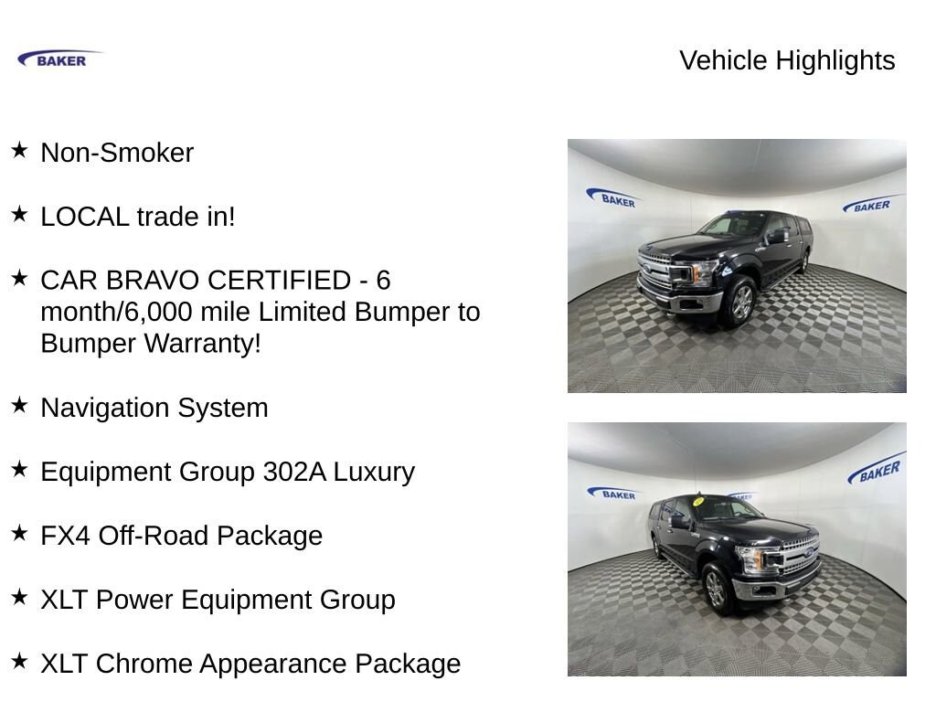 Black 2019 Ford F-150 XLT 4WD 10-Speed Automatic 5.0L V8 Non-Smoker, LOCAL trade in!, CAR BRAVO CERTIFIED - 6 month/6,000 mile Limited Bumper to Bumper Warranty!, F-150 XLT, 4D SuperCrew, 5.0L V8, 10-Speed Automatic, 4WD, Black, Medium Earth Gray w/Cloth 40/Console/40 Front Seats or Cloth 40/Console/40 Front Seats, 10-Way Power Driver & Passenger Seats, 4x4 FX4 Off-Road Bodyside Decal, AppLink/Apple CarPlay and Android Auto, Cloth 40/20/40 Front Seat, Electronic Locking w/3.55 Axle Ratio, Equipment Group 302A Luxury, Exterior Parking Camera Rear, Fixed Backlight w/Privacy Glass, FX4 Off-Road Package, Heated Front Seats, Hill Descent Control, LED Box Lighting, Navigation System, Off-Road Tuned Front Shock Absorbers, Power Glass Heated Sideview Mirrors, Power-Adjustable Pedals, Power-Sliding Rear Window, Radio: AM/FM Stereo w/6 Speakers, Rear Under-Seat Storage, Rear Window Defroster, Remote Start System, SYNC 3, Voice-Activated Touchscreen Navigation, Wheels: 18 Chrome-Like PVD, XLT Chrome Appearance Package, XLT Power Equipment Group.CALL US TODAY 6168373800. Recent Arrival! Odometer is 14848 miles below market average!