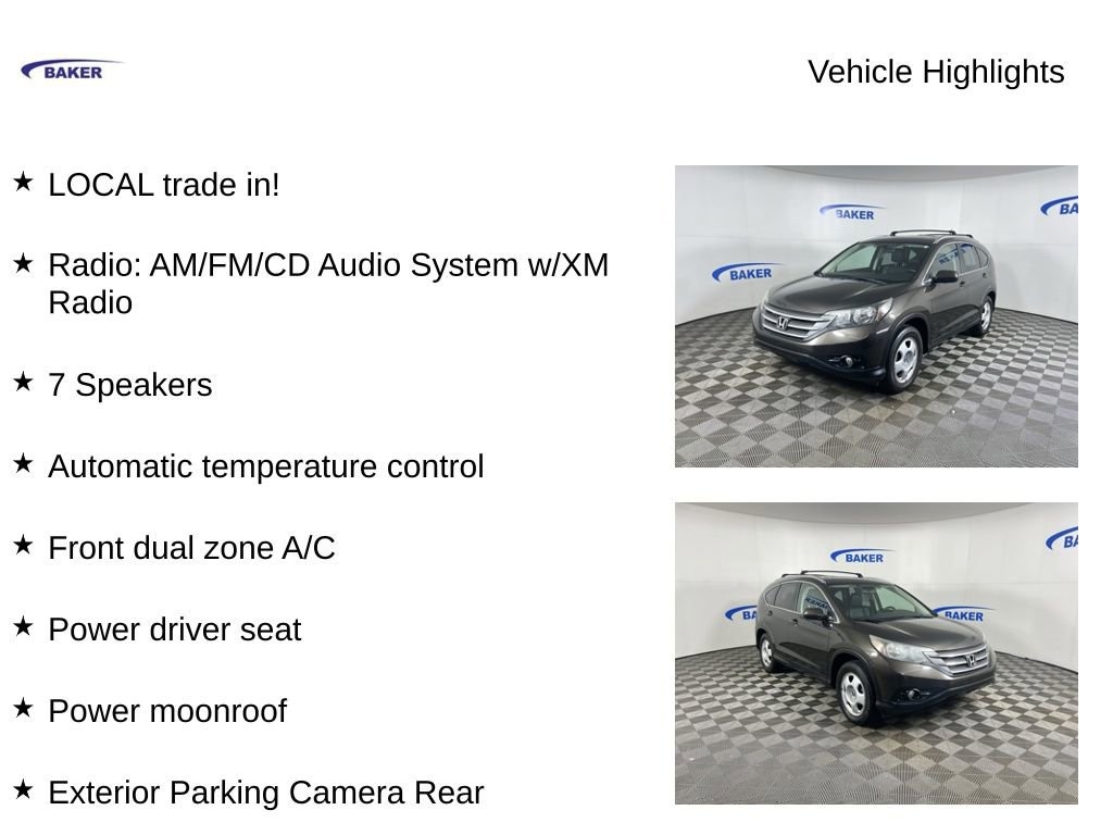 New Price! Urban Titanium Metallic 2013 Honda CR-V EX-L AWD 5-Speed Automatic 2.4L I4 DOHC 16V i-VTEC LOCAL trade in!, CR-V EX-L, 2.4L I4 DOHC 16V i-VTEC, AWD, Urban Titanium Metallic, Black w/Leather-Trimmed Seats, 17 10-Spoke Alloy Wheels, 7 Speakers, Automatic temperature control, Exterior Parking Camera Rear, Front dual zone A/C, Heated front seats, Passenger door bin, Power driver seat, Power moonroof, Radio: AM/FM/CD Audio System w/XM Radio.