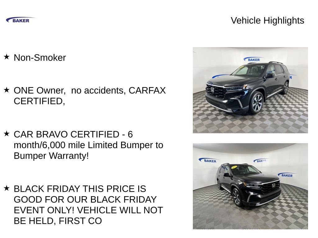 New Price! Black 2023 Honda Pilot Touring FWD 10-Speed Automatic 3.5L V6 DOHC 24V Non-Smoker, ONE Owner, no accidents, CARFAX CERTIFIED,, CAR BRAVO CERTIFIED - 6 month/6,000 mile Limited Bumper to Bumper Warranty!, BLACK FRIDAY THIS PRICE IS GOOD FOR OUR BLACK FRIDAY EVENT ONLY! VEHICLE WILL NOT BE HELD, FIRST CO, Pilot Touring, 3.5L V6 DOHC 24V, 10-Speed Automatic, FWD, Black, Black Leather, 12 Speakers, Adaptive Cruise Control: Adaptive Cruise Control (ACC) with Low-Speed Follow, Air Conditioning, Apple CarPlay/Android Auto, Automatic temperature control, Blind Spot Information (BSI) System warning, Bose Premium Sound System, Heated front seats, Lane departure: Lane Keeping Assist System (LKAS) active, Memory seat, Navigation system: Honda Satellite-Linked Navigation System, Power driver seat, Power Liftgate, Power moonroof, Power passenger seat, Reclining 3rd row seat, Wheels: 20 Machine Face Shark Gray w/Blk Lug Nuts.