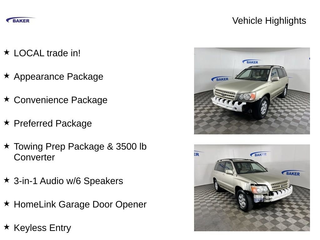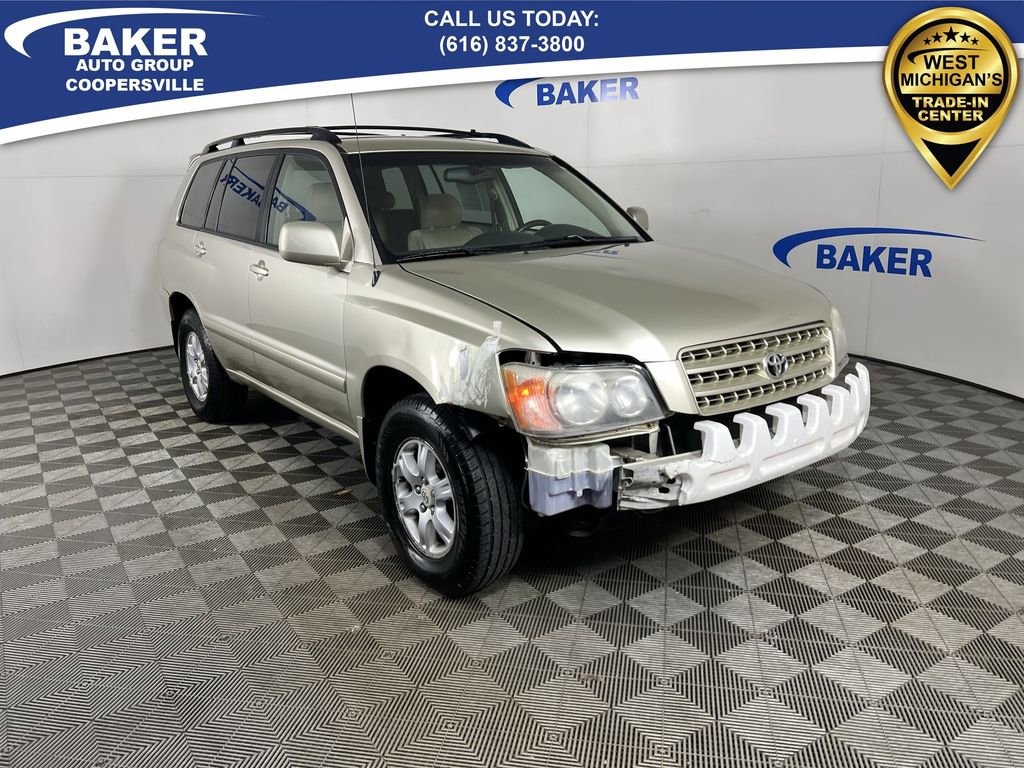 Vintage Gold Metallic 2002 Toyota Highlander V6 AWD 4-Speed Automatic with Overdrive 3.0L V6 SMPI DOHC LOCAL trade in!, Highlander V6, 3.0L V6 SMPI DOHC, 4-Speed Automatic with Overdrive, AWD, 16 x 6.5 Silver Styled Steel Wheels, 3-in-1 Audio w/6 Speakers, 8-Way Power Driver Seat, Appearance Package, Color Keyed Mudguards, Convenience Package, HomeLink Garage Door Opener, Keyless Entry, Preferred Package, Rear Side Dark Tint Privacy Glass, Tonneau Cover, Towing Prep Package & 3500 lb Converter.CALL US TODAY 6168373800. Recent Arrival!