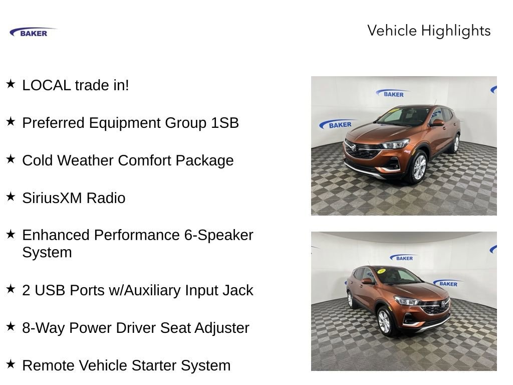New Price! Certified. Burnished Bronze Metallic 2020 Buick Encore GX Preferred AWD 9-Speed Automatic ECOTEC 1.3L Turbo LOCAL trade in!, Encore GX Preferred, ECOTEC 1.3L Turbo, AWD, 2 USB Ports w/Auxiliary Input Jack, 2-Way Power Driver Lumbar Control, 4-Way Manual Passenger Seat Adjuster, 6-Way Manual Driver Seat Adjuster, 8-Way Power Driver Seat Adjuster, Apple CarPlay/Android Auto, Cold Weather Comfort Package, Enhanced Performance 6-Speaker System, Exterior Parking Camera Rear, Heated Driver & Front Passenger Seats, Power Tilt-Sliding Moonroof, Preferred Equipment Group 1SB, Remote Vehicle Starter System, SiriusXM Radio, Wheels: 18 Bright Silver Painted Aluminum.CALL US TODAY 6168373800. Recent Arrival! 26/29 City/Highway MPGCertification Program Details: 12-month/12,000-mile * Bumper-to-Bumper Limited Warranty coverage with no deductible.