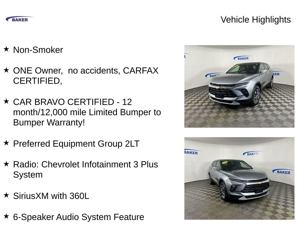 New Price! Sterling Gray Metallic 2025 Chevrolet Blazer LT AWD 9-Speed Automatic with Overdrive 2.0L Turbocharged Non-Smoker, ONE Owner, no accidents, CARFAX CERTIFIED,, CAR BRAVO CERTIFIED - 12 month/12,000 mile Limited Bumper to Bumper Warranty!, Blazer LT, 4D Sport Utility, 2.0L Turbocharged, AWD, Sterling Gray Metallic, 6-Speaker Audio System Feature, Apple CarPlay/Android Auto, Auto High-beam Headlights, Automatic temperature control, Electronic Stability Control, Front Bucket Seats, Fully automatic headlights, Heated front seats, Preferred Equipment Group 2LT, Premium audio system: Chevrolet Infotainment 3 Plus, Radio: Chevrolet Infotainment 3 Plus System, Ride and Handling Suspension, SiriusXM with 360L.CALL US TODAY 6168373800. Odometer is 7508 miles below market average! 22/27 City/Highway MPG
